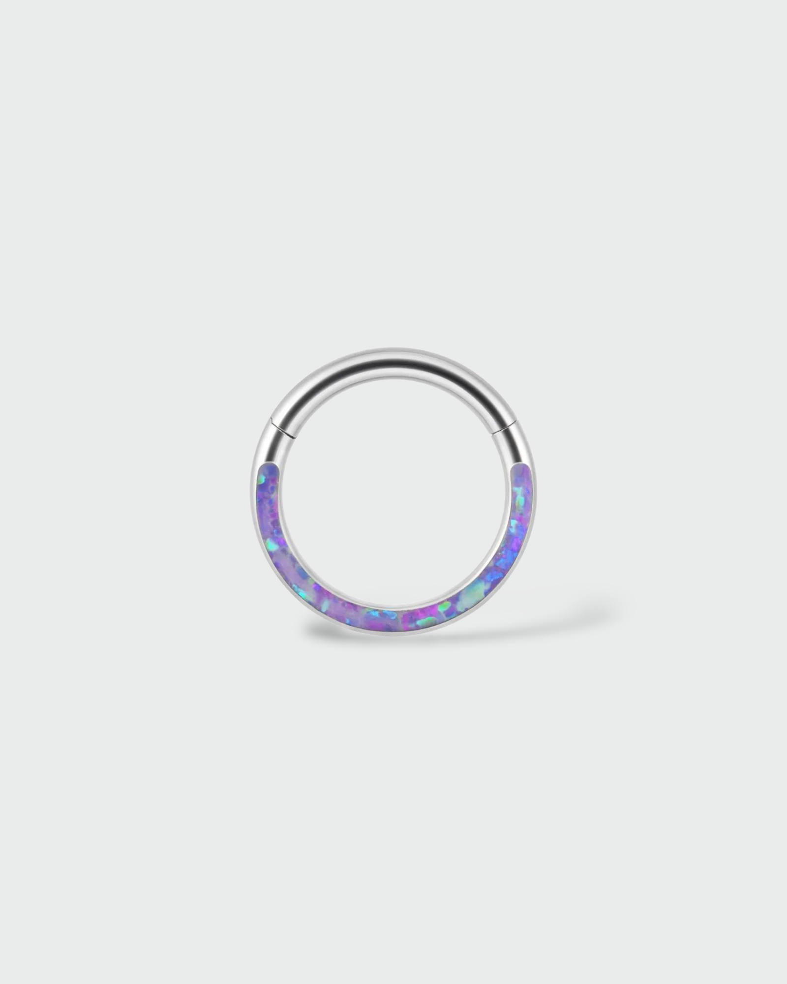 Un aro que vibra en tonos de magia y naturaleza 🌿✨. Este clicker en titanio grado implante está decorado con incrustaciones de ópalo morado que reflejan luz en cada movimiento.
