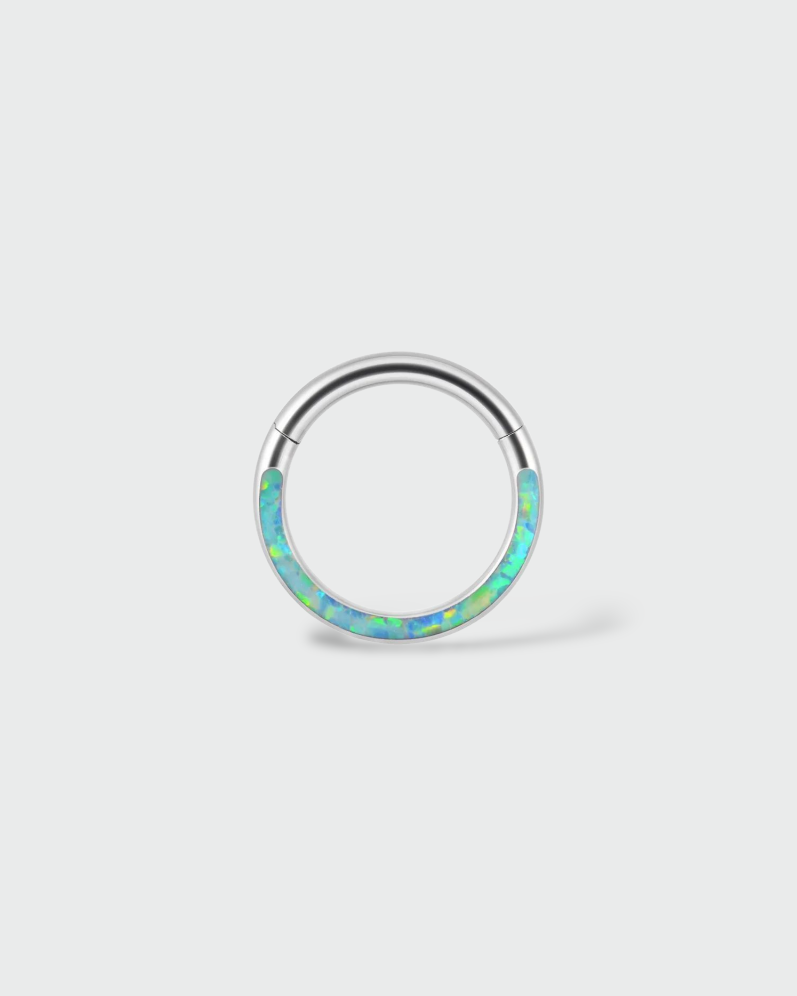 Un aro que vibra en tonos de magia y naturaleza 🌿✨. Este clicker en titanio grado implante está decorado con incrustaciones de ópalo verde que reflejan luz en cada movimiento.